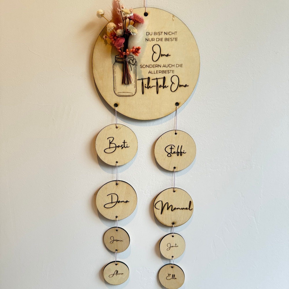 Suchst du ein emotionales und gleichzeitig dekoratives Geschenk zum Muttertag? Dann ist dieses liebevoll gestaltete Holzschild genau das Richtige. Es bringt nicht nur die Augen der besten Oma oder Uroma zum Leuchten, sondern eignet sich auch als Geschenk für Papa, Mama, Opa oder eine andere Herzensperson in deinem Leben. Dank individueller Personalisierung ist dieses Holzschild ein echter Familienmoment zum Aufhängen.